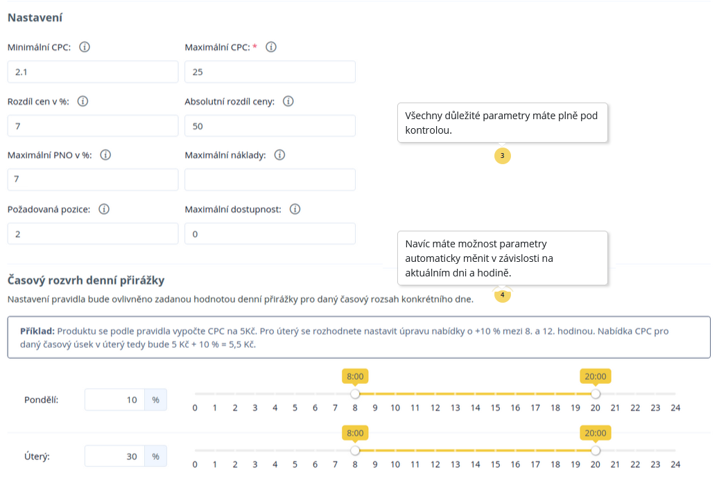 Minimální ceny za proklik vychází dle rozsahu prodejní ceny a kategorie, do které produkt náleží. Bidovací pravidla lze nastavit v editoru XML pomocí pravidla Přidat/Upravit element.